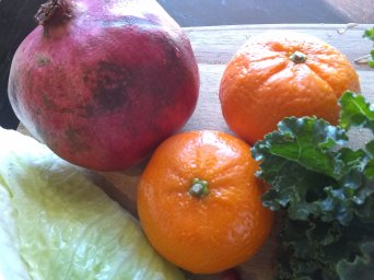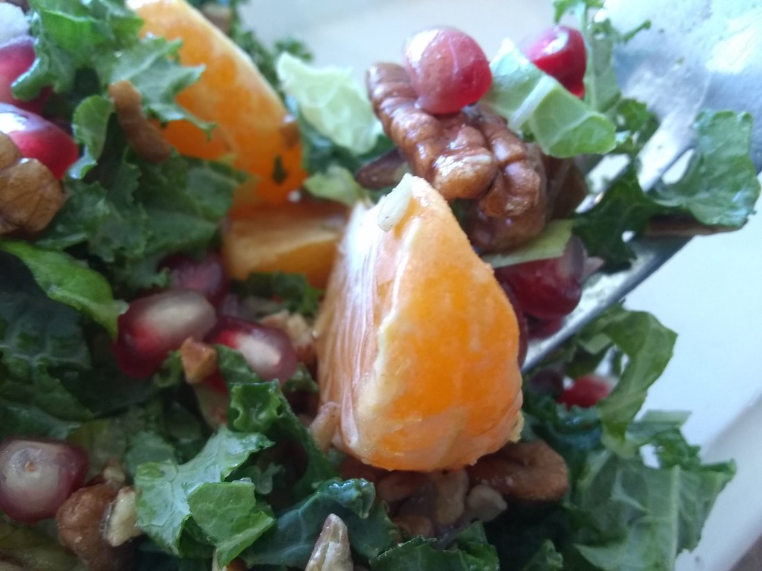 For the dressing, combine one teaspoon toasted sesame oil with a teaspoon of Dijon mustard and a half teaspoon of honey (the pomegranate and the orange adds a lot of natural sweetness already to this salad, so you don’t need much honey and could even choose to omit if you desire) and the juice from a mandarin orange. Add a pinch of cayenne pepper to complete and your salad world will never be the same.