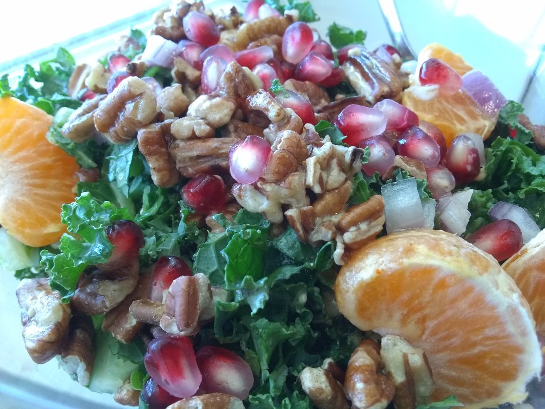 Speaking of love, I absolutely love pecans in this salad. I used about 1/4 c. in my salad, so about the same amount of pecans as pomegranate. If pecans aren’t your thing then you can replace with walnuts or slivered almonds if you desire. The pecans, especially when teamed up with the oranges and the pomegranate, remind me of fall. If you have a toaster oven, set it at 350 degrees and toast for just a few minutes. They will burn easily, but you’ll know they are done because you will start to smell that awesome toasty aroma. Just watch them closely.